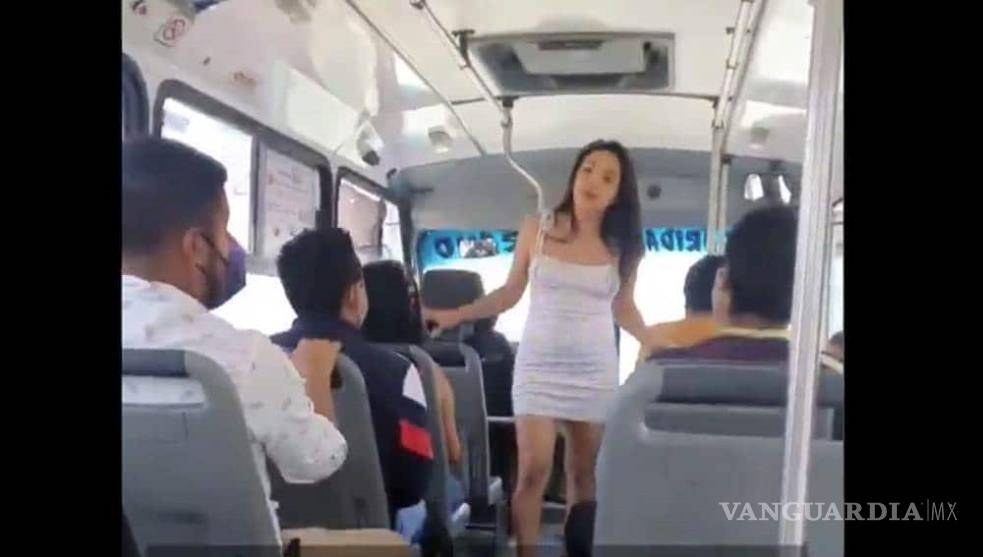Annie Sex Teen camina por el pasillo de la unidad y permite que los pasajeros incluso la toquen en la que es su segunda protesta en la ciudad de Puebla para pedir la reapertura de los centros nocturnos de Puebla.