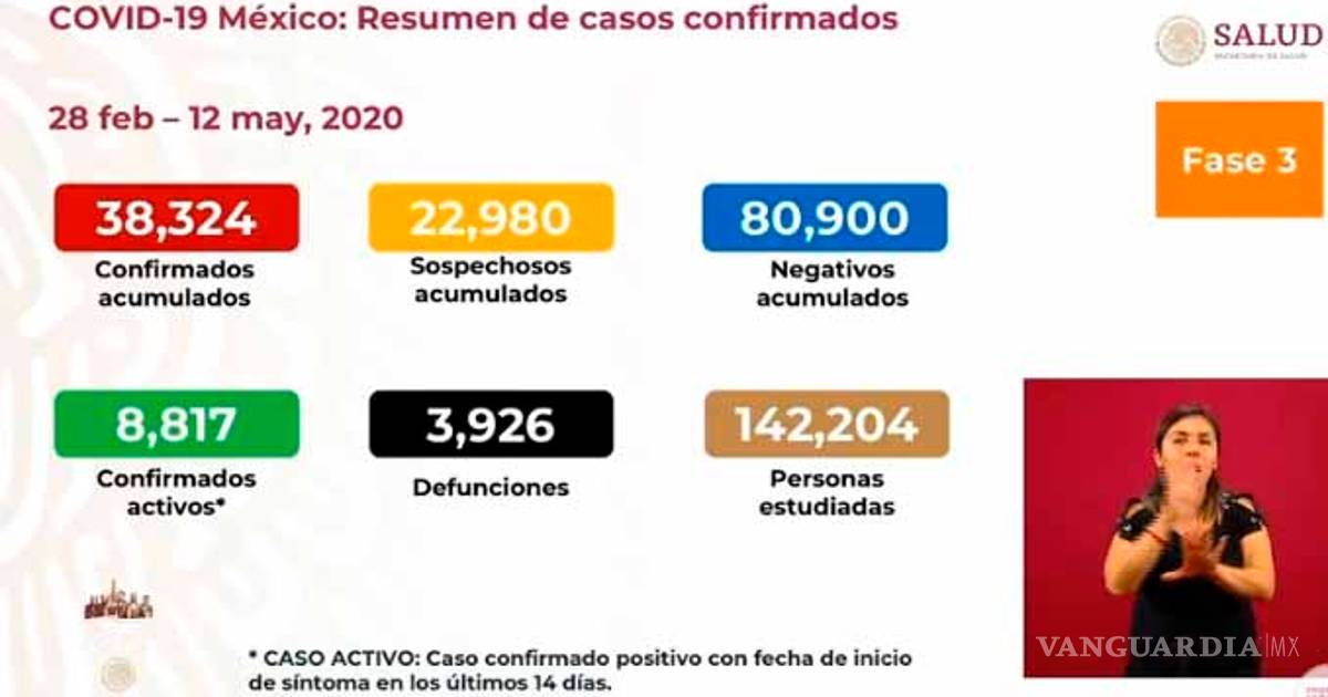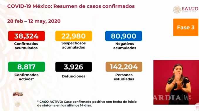 México registra un total de 38,324 casos positivos a COVID-19; con 8,817 activos y 3,926 fallecidos