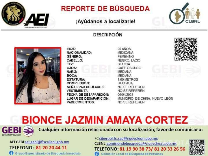 MONTERREY, NL.- En entrevista telefónica con VANGUARDIA, la madre de Bionce Jazmín Amaya Cortez, joven residente de Mission, Texas quien desapareció en China, Nuevo León aseguró que su hija estuvo en territorio mexicano conviviendo con grupo de amigos que no ha brindado información de su paradero.