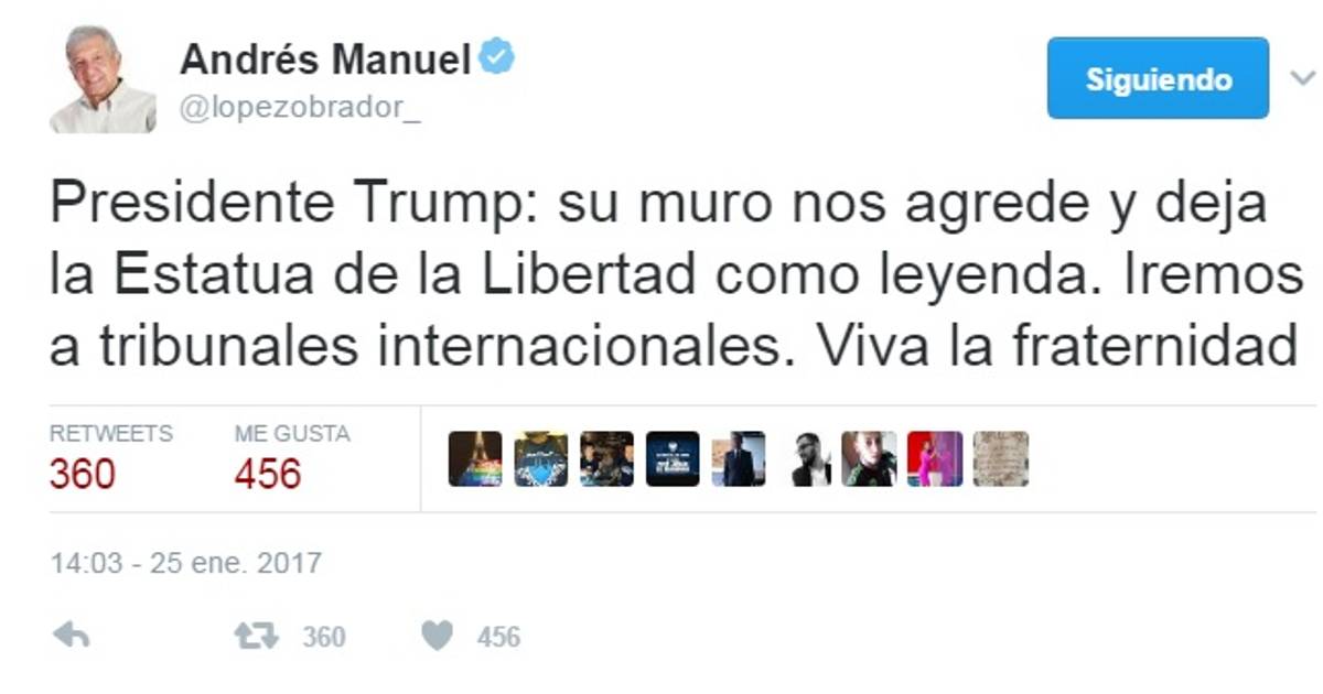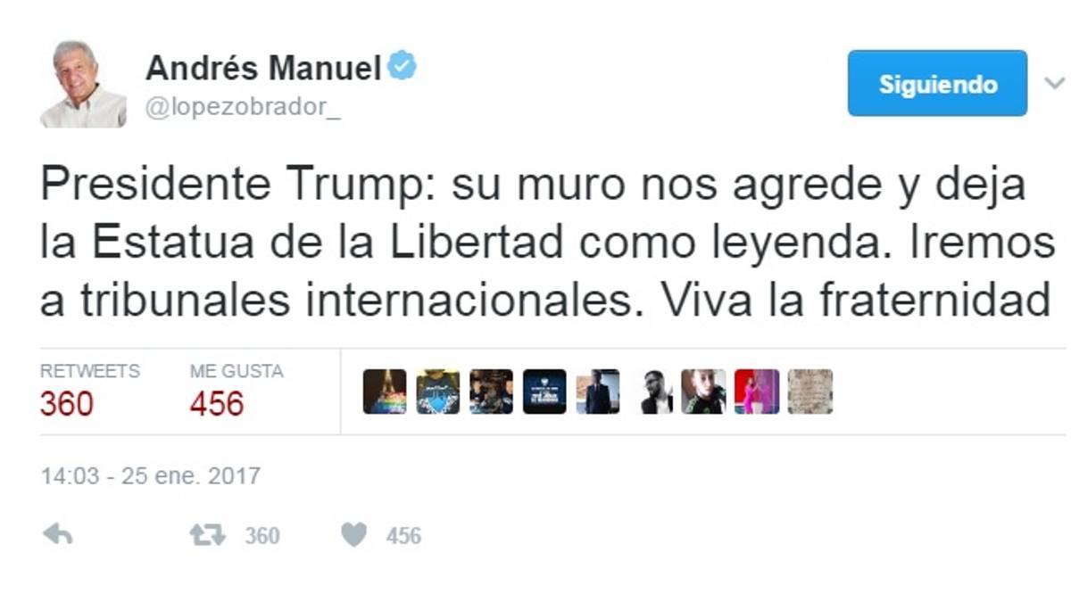 "Su muro nos agrede y deja la Estatua de la Libertad como leyenda. Iremos a tribunales internacionales. Viva la fraternidad", escribió López Obrador en su Twitter