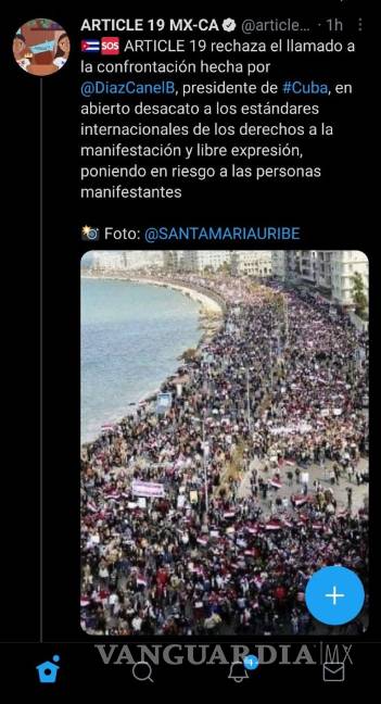 “Yo veo que están interviniendo, por ejemplo, ayer vi un mensaje en redes sociales de un grupo que se llama Artículo 19, que es una asociación periodística financiada en México por el gobierno de Estados Unidos, por la embajada de Estados Unidos, y ayer casualmente esta organización, que ya hemos denunciado, sacó una foto y esto es sólo una muestra de lo que han hecho a nivel mundial contra quienes no están de acuerdo con el gobierno de Cuba”, acusó el mandatario.