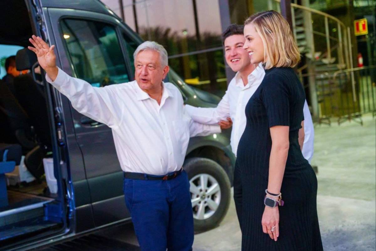 El gobernador de Nuevo León, Samuel García, acompañado de su esposa, Mariana Rodríguez le dio la bienvenida al mandatario.