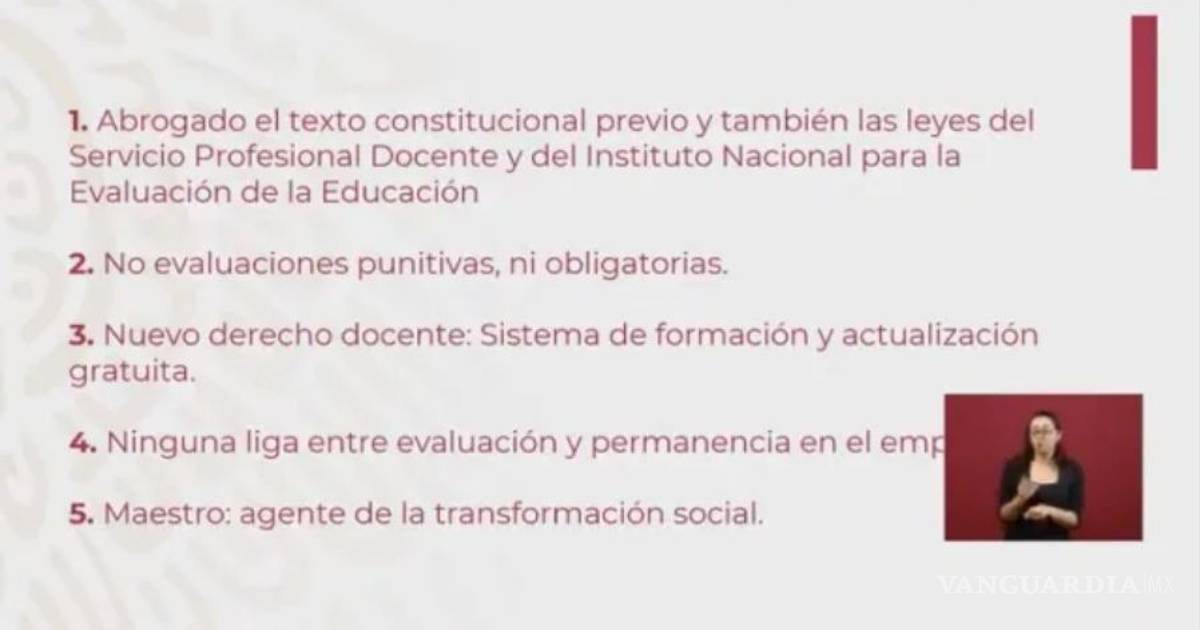 Durante la conferencia de prensa de Andrés Manuel López Obrador este jueves por la mañana, Esteban Moctezuma Barragán presentó los 26 puntos que los diputados discutirán para presentar una nueva Reforma Educativa mientras afirmó que no habrá más evaluaciones punitivas ni obligatorias para los docentes y regresarán las clases de civismo a las escuelas.