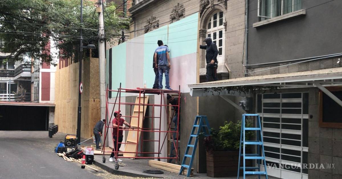 En el video, compartido en Twitter, se muestra el momento en que cinco trabajadores de la construcción levantan una protección de madera que cubre el frente del hogar del comunicador.