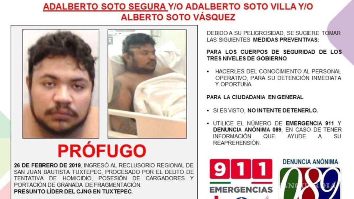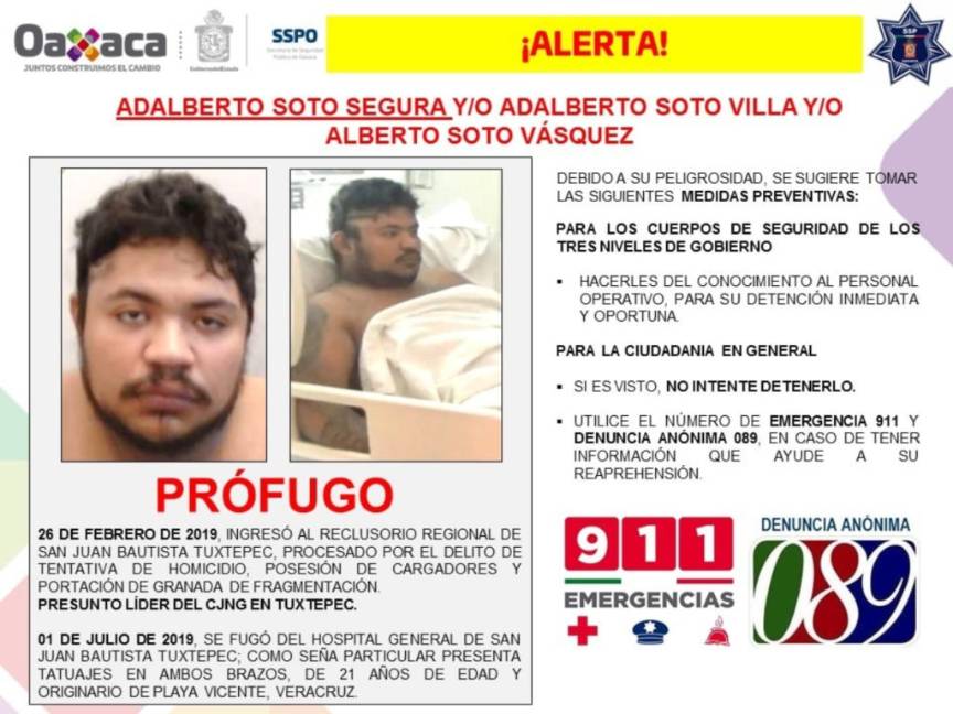 Este lunes Adalberto Soto, presunto líder del Cártel Jalisco Nueva Generación (CJNG), se fugó del Hospital General de San Juan Bautista Tuxtepec, confirmó la Secretaría de Seguridad Pública de Oaxaca (SSPO).