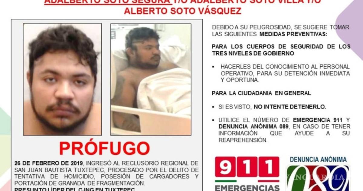 El gobierno de Oaxaca emitió una alerta para informar a la población sobre los hechos. En la ficha se observa una imagen de Adalberto Soto con información sobre su ingreso al reclusorio regional de Tuxtepec el pasado 26 de febrero de 2019.