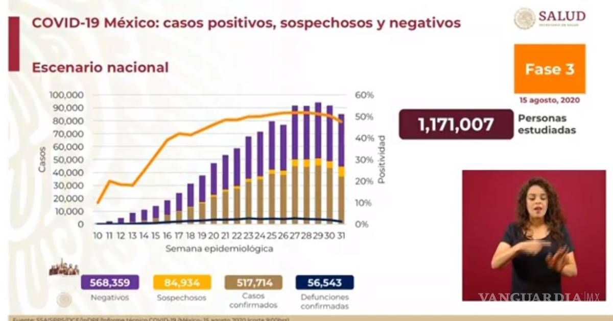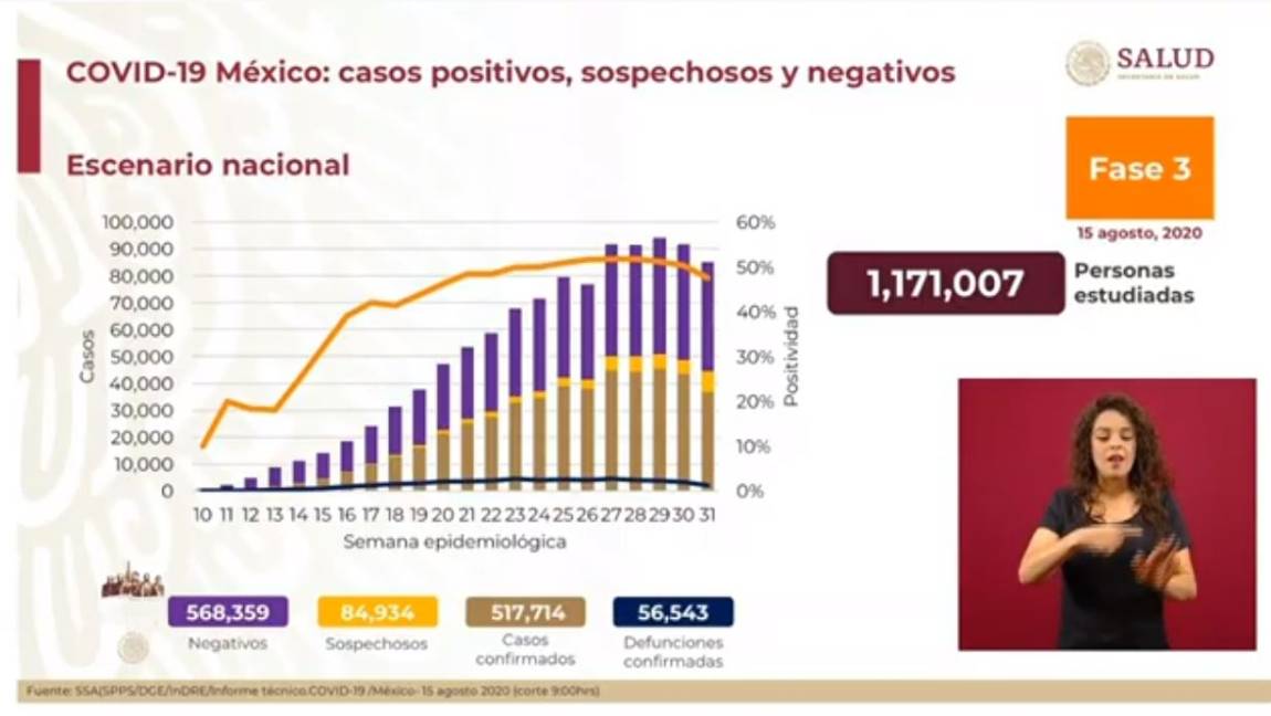En el último reporte, del 13 de agosto, fueron confirmados 511 mil 369 casos positivos y 55 mil 908 defunciones.