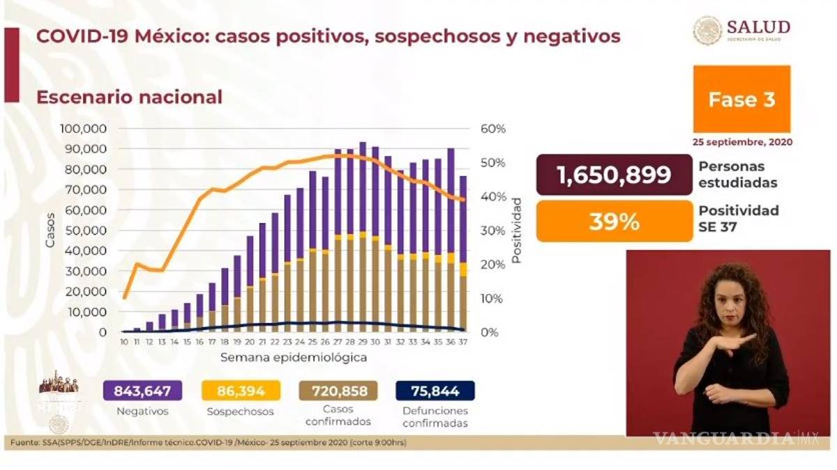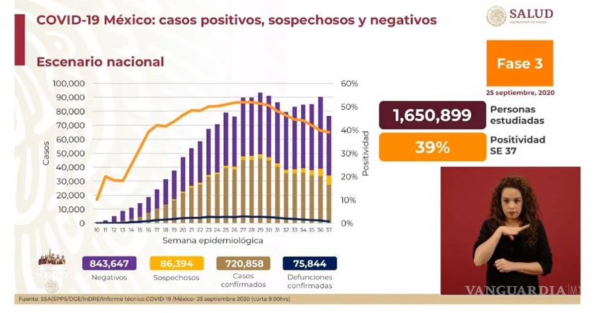 En el último reporte, del 24 de septiembre, fueron confirmados 715 mil 457 casos positivos y 75 mil 439 defunciones.