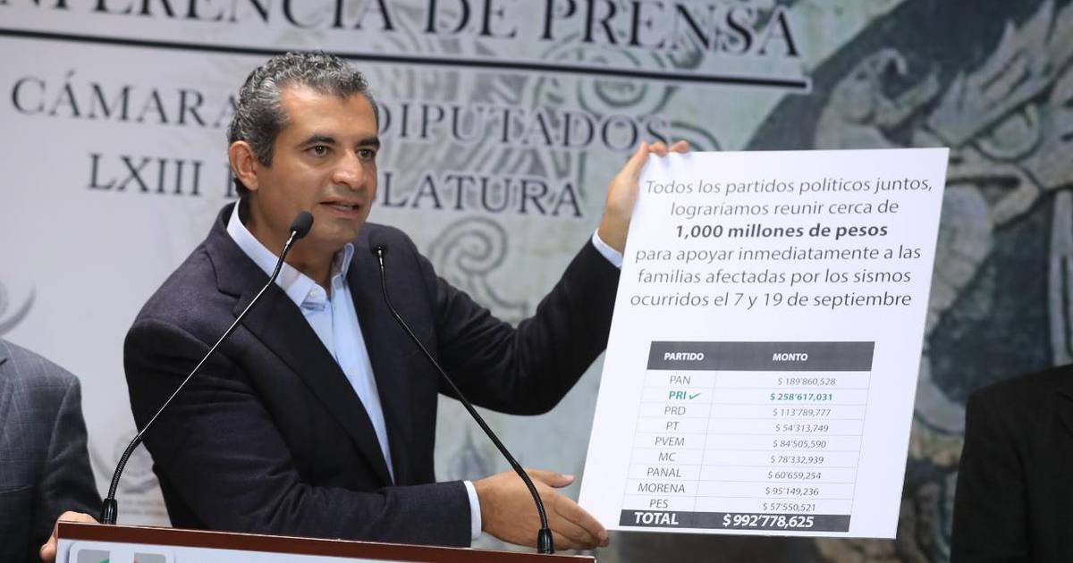 En conferencia de prensa, el presidente nacional del tricolor, Enrique Ochoa, sostuvo que con su propuesta de cero diputados plurinominales se pueden destinar 11 mil 600 millones de pesos para apoyar a damnificados por el sismo del pasado 19 de septiembre.