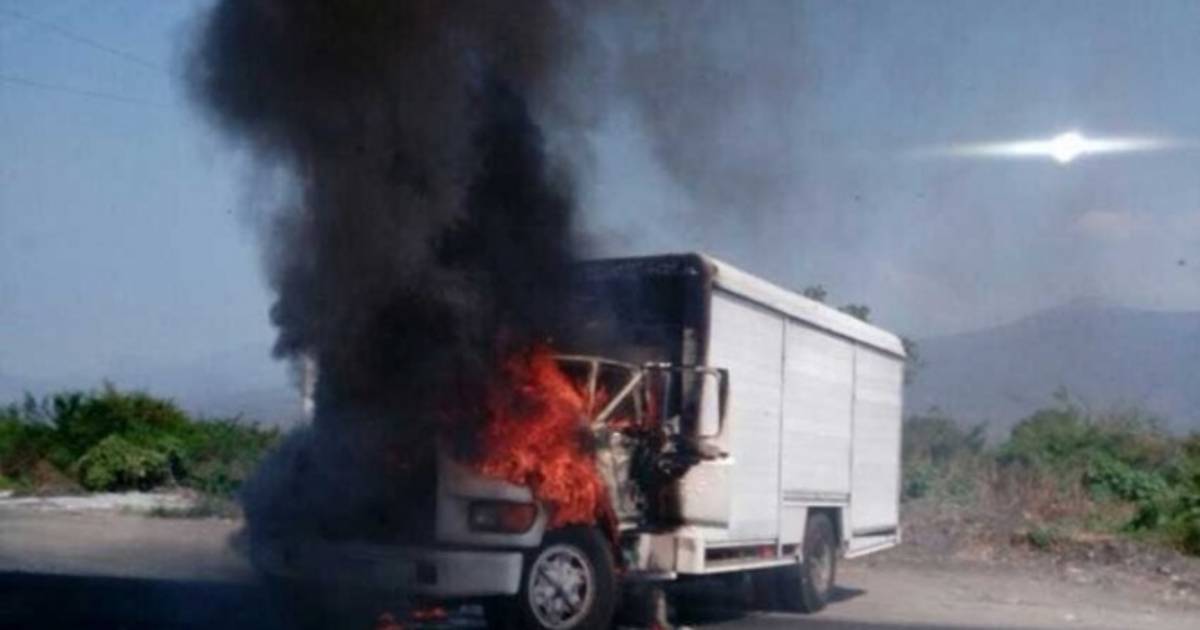 Tras la captura de “El Greñas”, civiles armados se robaron tres vehículos para atravesarlos en la carretera Apatzingán-Aguililla.