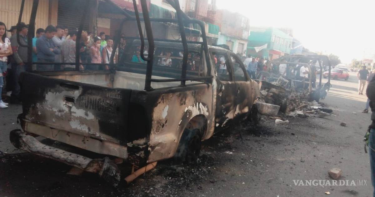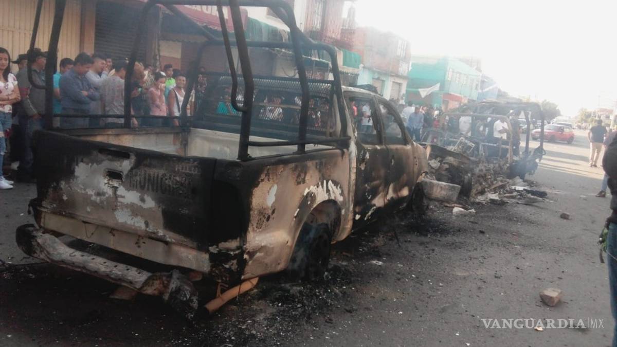 Los residentes arremetieron e incendiaron cuatro vehículos de la Policía Municipal, dos camionetas pick up, y dos motocicletas.