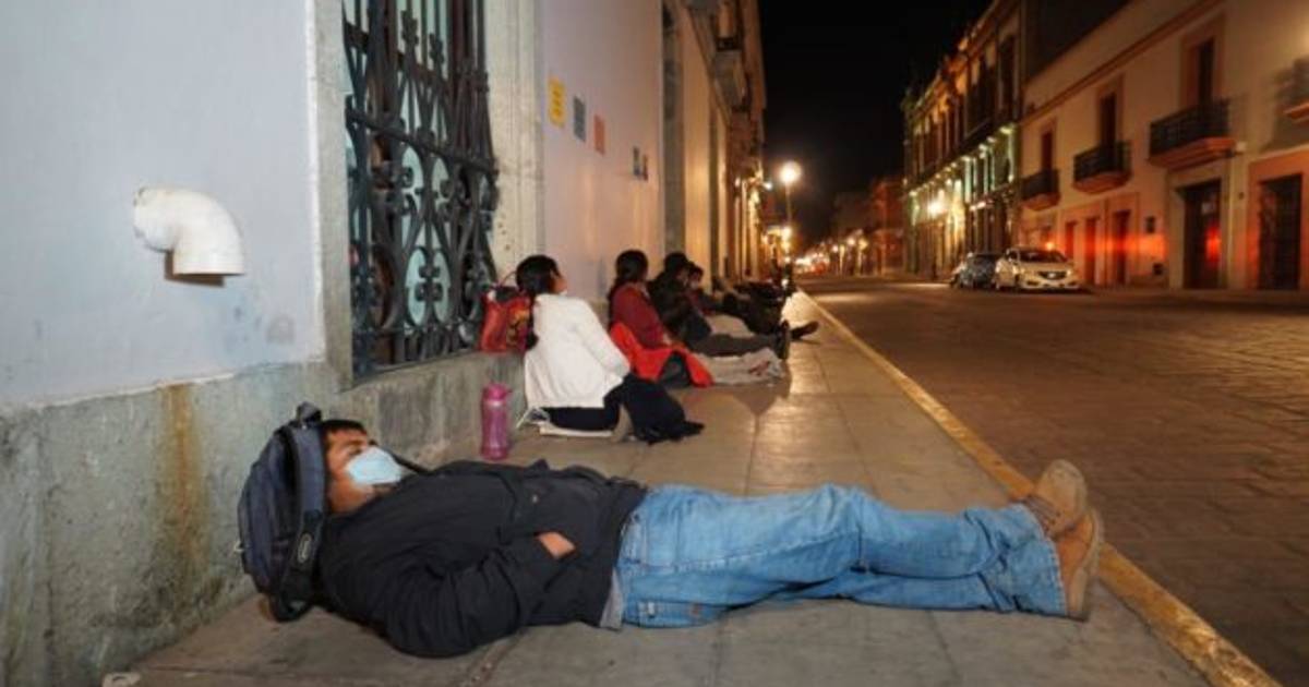Oaxaca.- En plena fase 3 de la contingencia por Covid-19, unos 30 indígenas provenientes de la Sierra Sur de Oaxaca, hicieron guardia y se durmieron anoche en las banquetas de los bancos en pleno centro de la capital del estado, con la intención de no perder su lugar en la fila y cobrar a primera hora de este miércoles el apoyo que reciben del programa federal “Producción para el bienestar” antes ProAgro.