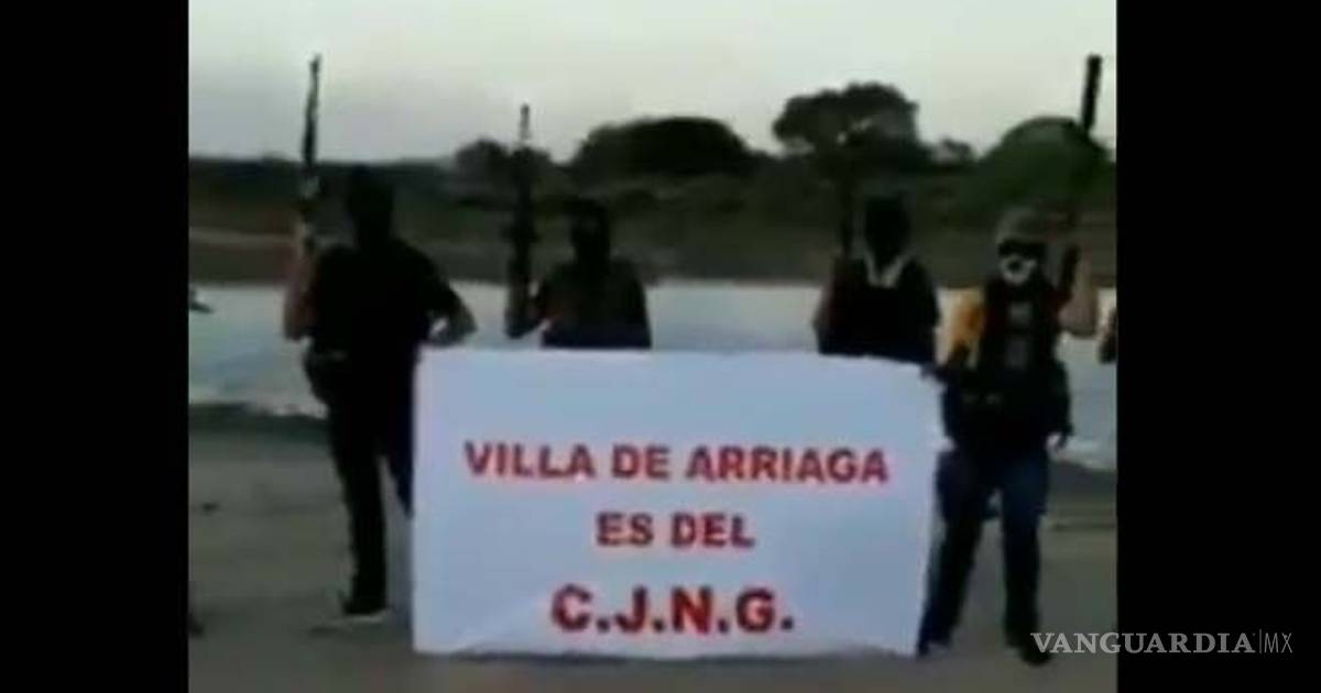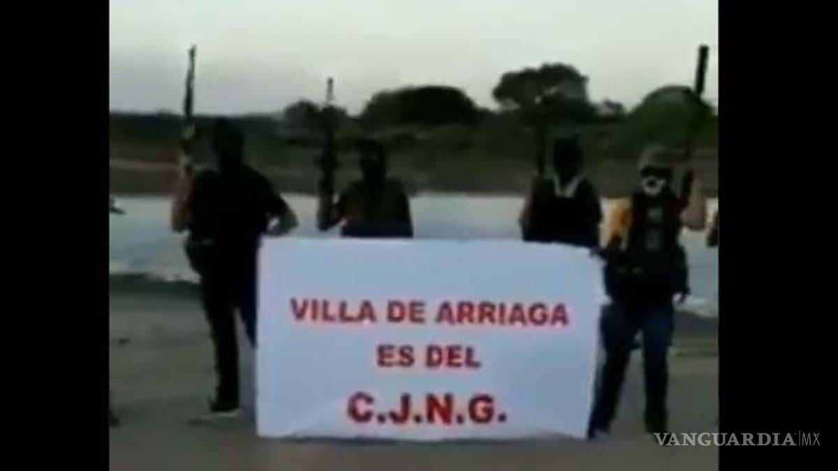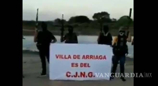 Los matones que tapan su rostro con capuchas negras muestran un mensaje que lee: “Villa de Arriaga es del CJNG”.