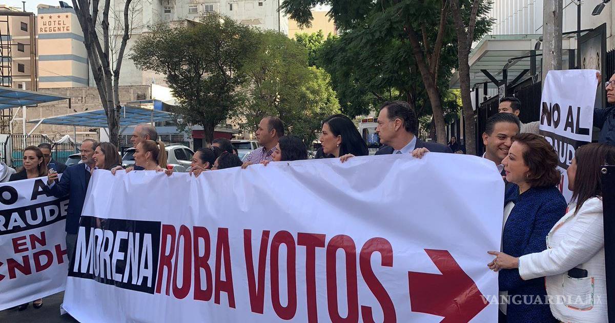 Con pancartas y mantas los legisladores buscan que el proceso para elegir al nuevo titular de la CNDH se repita, ya que denunciaron que durante la votación presuntamente fraude por un supuesto doble voto.