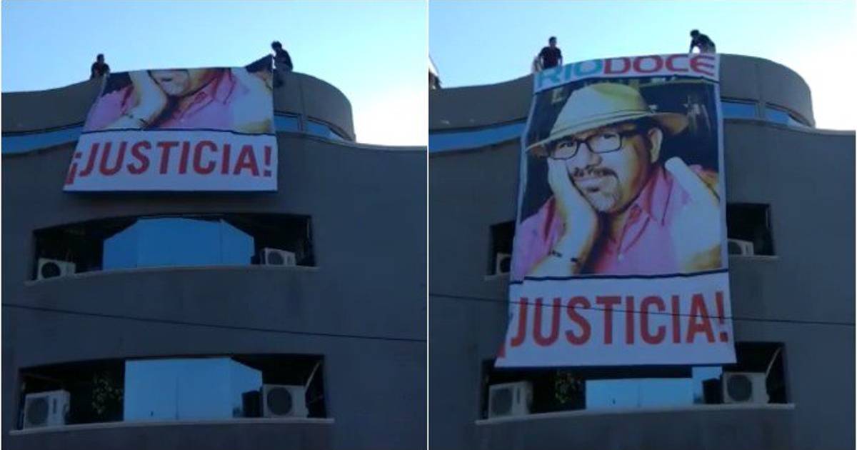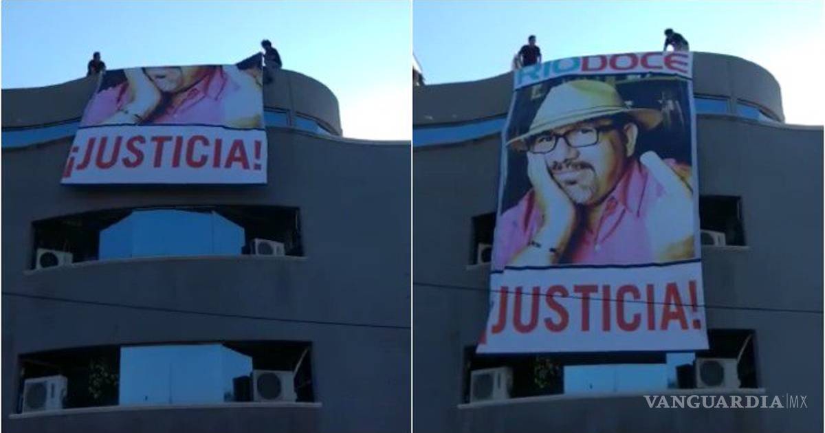 Una enorme manta, con la figura del periodista y escritos de Javier Valdez Cárdenas, asesinado hace dos semanas en esta ciudad, fue colocada en la fachada de la cadena periodística "Noroeste", en esta ciudad, con el texto: "Justicia", en letras rojas.