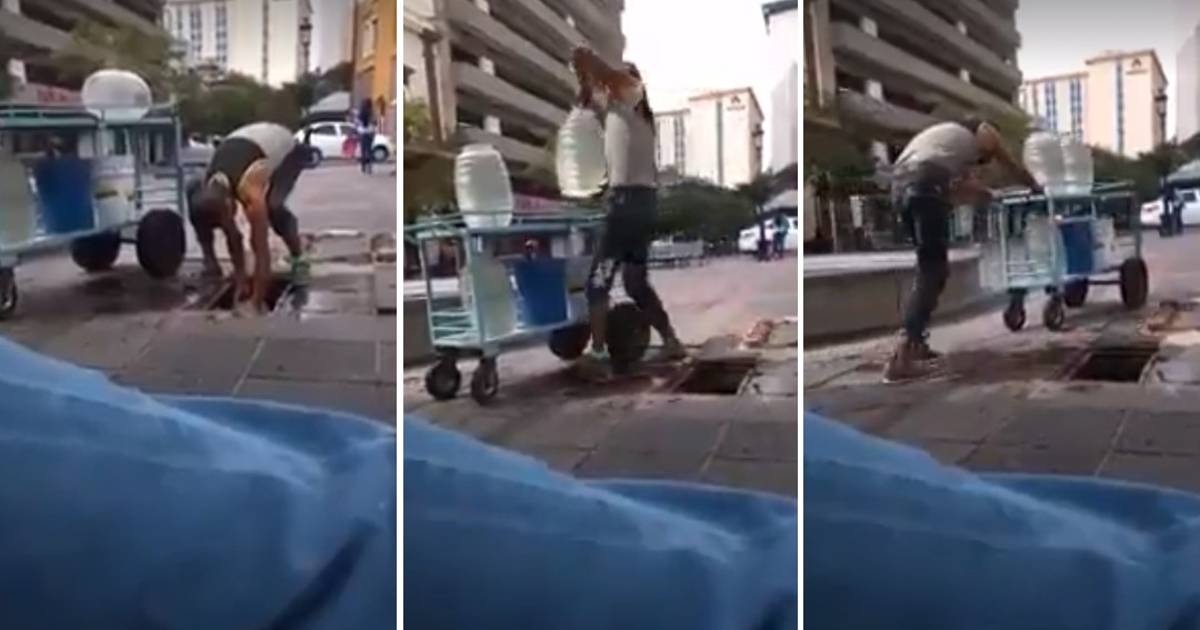 En redes sociales se hizo viral un video en que se muestra a un hombre mientras sacaba agua de un registro con bidones que regularmente son usados para la venta de aguas frescas, por lo que usuarios asumieron que el líquido lo quería para este fin.