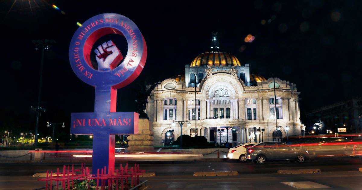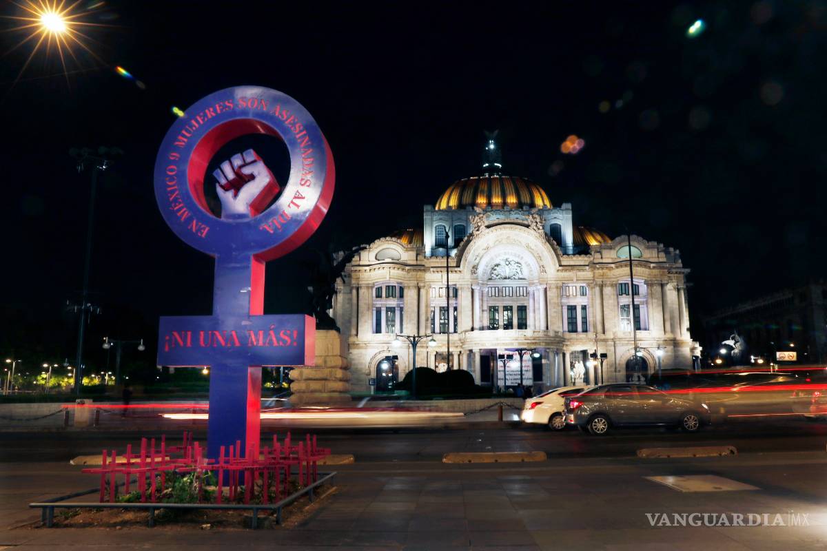 En otro sitio, un círculo púrpura con una cruz debajo, el símbolo reconocido internacionalmente para el género femenino, y un puño levantado y cerrado exigen “¡Ni una más!”, en relación con los feminicidios. En la base, hay un jardín lúgubre con cruces rosas que tienen inscrito el nombre de los estados del país.