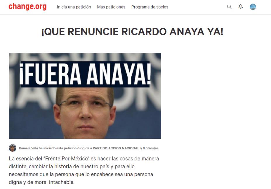 Derivado de los continuos escándalos de lavado de dinero en los que se ha visto envuelto el candidato Por México al Frente, Ricardo Anaya Cortés, la petición ¡Que renuncie Ricardo Anaya ya! ha sido difundida en la plataforma change.org.
