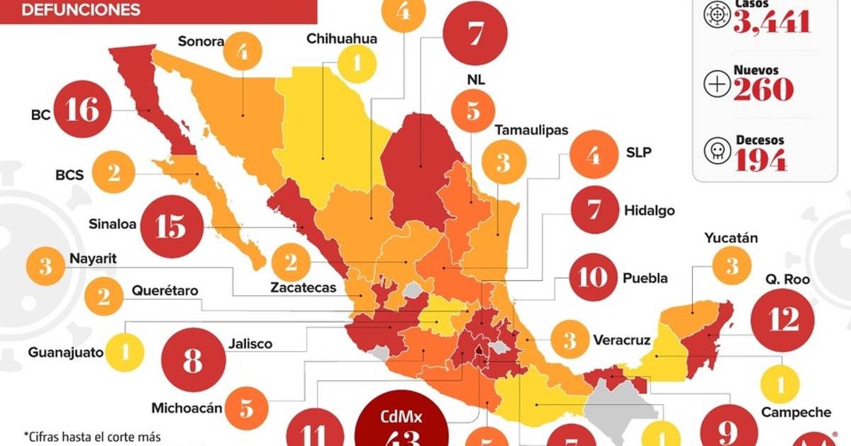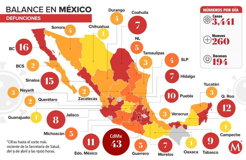 La Secretaría de Salud reportó que en el país han muerto 194 personas por coronavirus y se han detectado 3 mil 441 casos de la enfermedad. Además, el director del Centro Nacional de Transfusión Sanguínea Jorge Trejo Gómora, explicó que se está investigando si el plasma de la sangre de personas recuperadas sirve como tratamiento en pacientes graves. De acuerdo con datos de la dependencia, en las últimas 24 horas se sumaron 20 defunciones y 260 casos de coronavirus, que aumentaron principalmente en la Ciudad de México, donde se reportaron 55 nuevos contagios. Además, del jueves 2 de abril a este jueves, el país pasó de tener mil 510 casos de coronavirus y 50 defunciones, a tener 3 mil 441 contagios y 194 muertes; lo que implica un aumento de mil 931 infecciones y 144 muertes.
