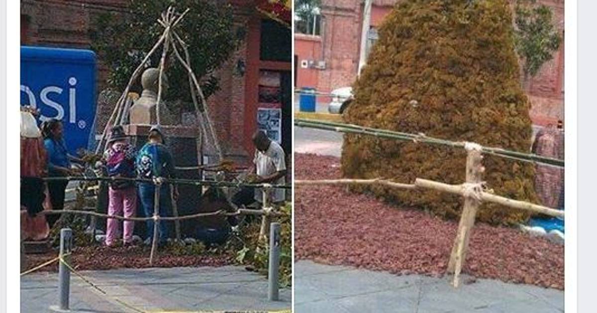 Un usuario de Facebook de nombre Jaime Cobián primero compartió en su muro unas fotografías donde se ve que algunos trabajadores montan una estructura con palos y malla en torno a la escultura para después colocar fronda y ocultarla.