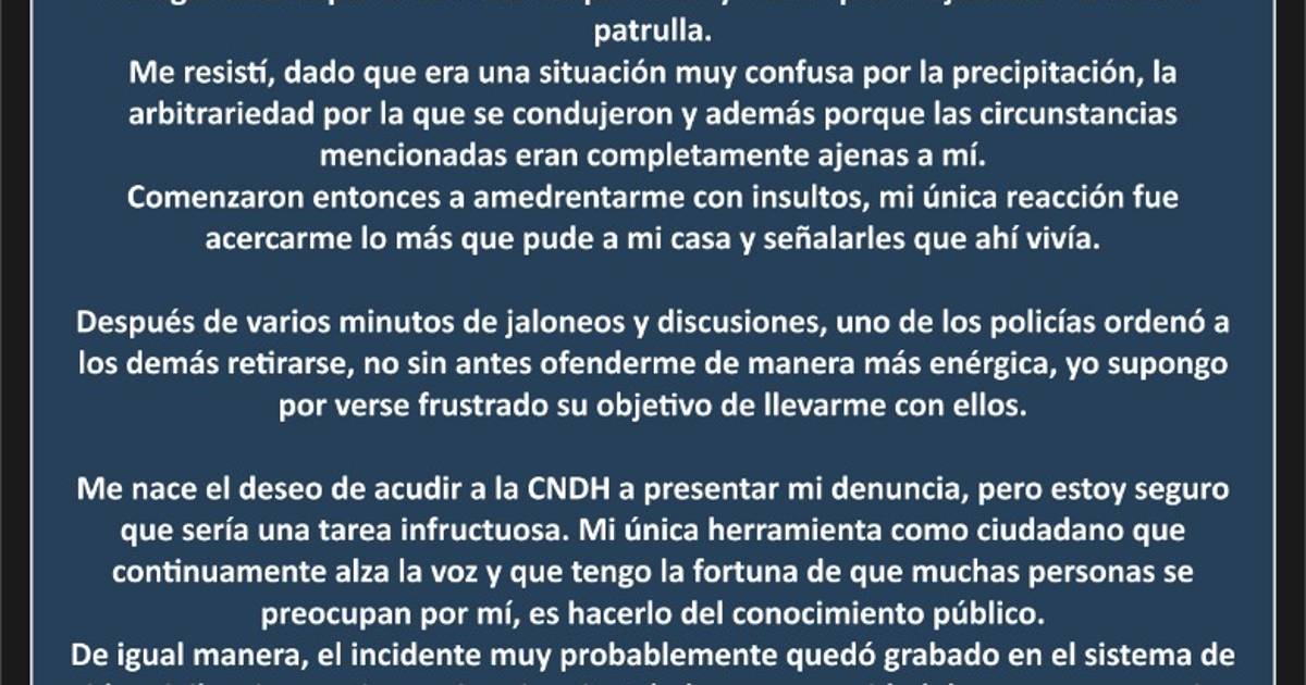 “Comenzaron entonces a amedrentarme con insultos, mi única reacción fue acercarme lo más que pude a mi casa y señalarles que ahí vivía”, escribió en un texto publicado en su cuenta de Twitter.