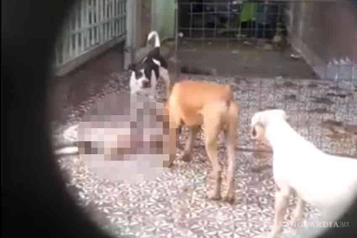 En uno de los videos captados por un usuario identificado en Facebook como Ariel Peña se observa como al interior de un inmueble un perro que se encuentra con otros en el patio de ese domicilio muerde a un gato sin vida y lo mastica.