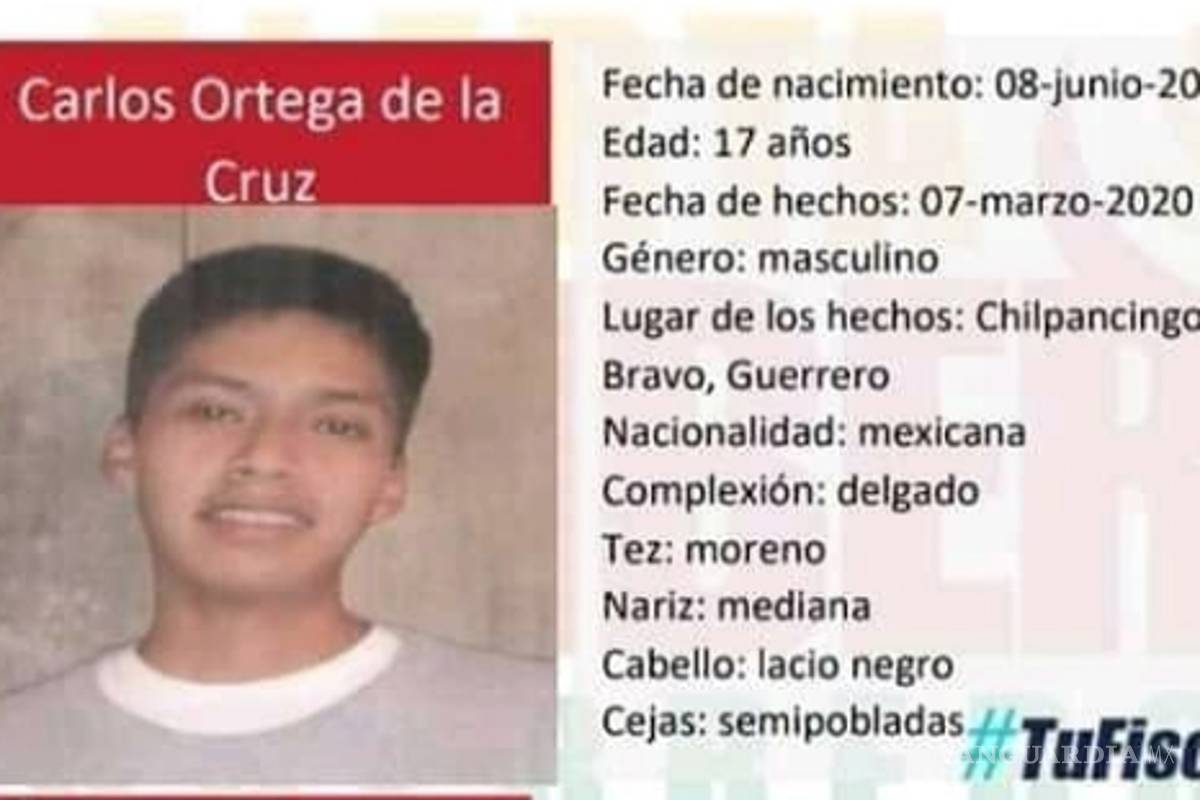 Carlos, de 17 años, es hijo de Melitón Ortega García, y fue visto por última vez el sábado 7 de marzo en Chilpancingo, Guerrero.