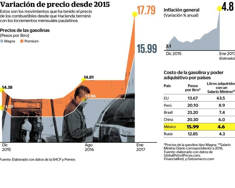 Pero a partir de la liberación al mercado global, los gasolinazos llevarían a la Magna a un costo de 15.17 pesos por litro, a la Premium a 16.09 pesos y al diésel a 14.73 pesos, calculó la Asociación Mexicana de Empresarios Gasolineros (Amegas).