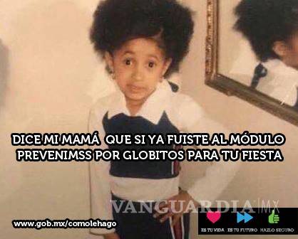 A través de su cuenta de Facebook, el IMSS publicó un meme con la foto de la rapera y la leyenda: dice mi mamá que si ya fuiste al módulo del PREVENIMSS por los globitos para tu fiesta.
