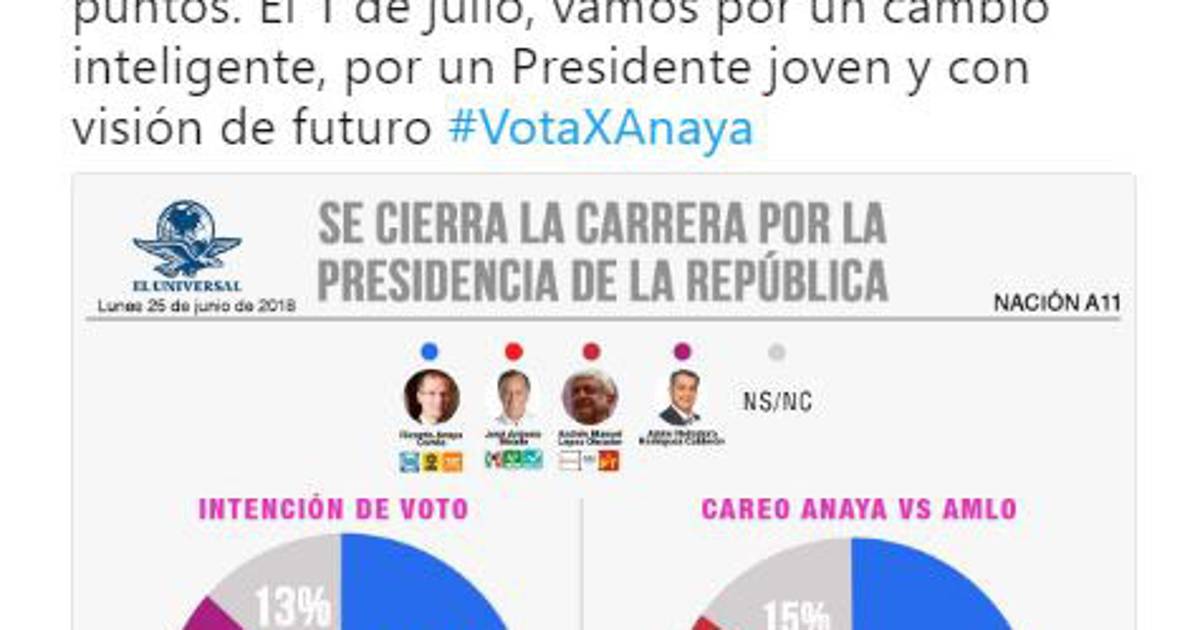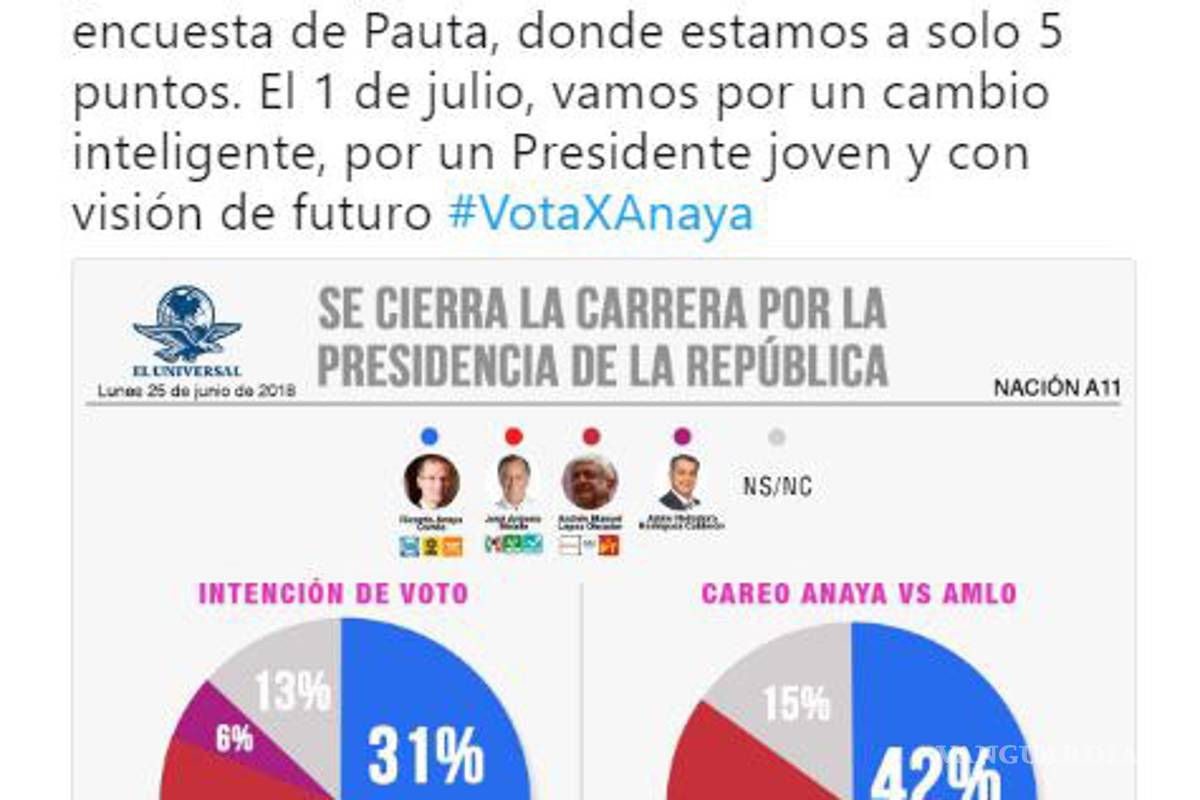 La encuesta falsa, que aparece con el logotipo de El Universal y no muestra metodología alguna, ubica a Ricardo Anaya, candidato presidencial de la Coalición Por México al Frente, con una intención de voto de 31 por ciento, sólo cinco puntos abajo de Andrés Manuel López Obrador, a quien el sondeo atribuye 36 por ciento de los sufragios potenciales.