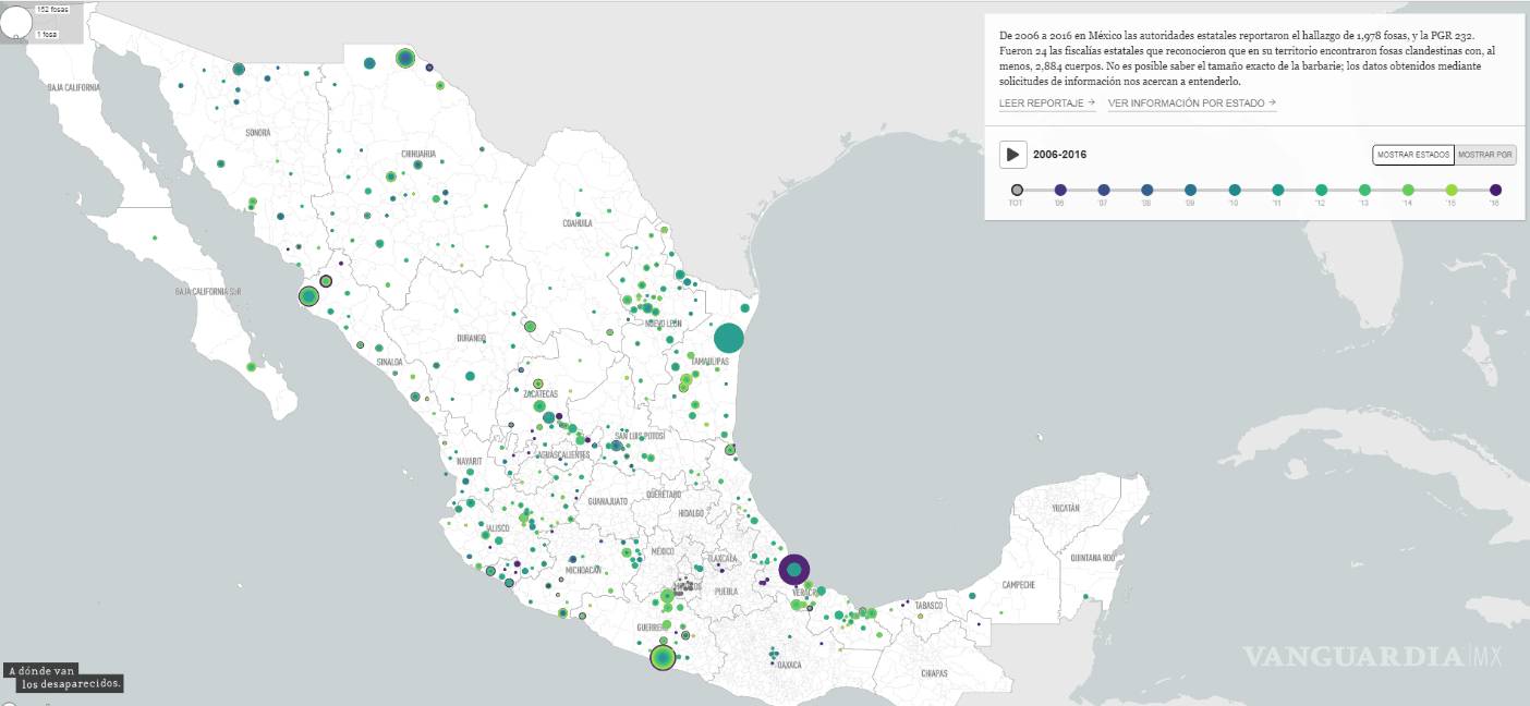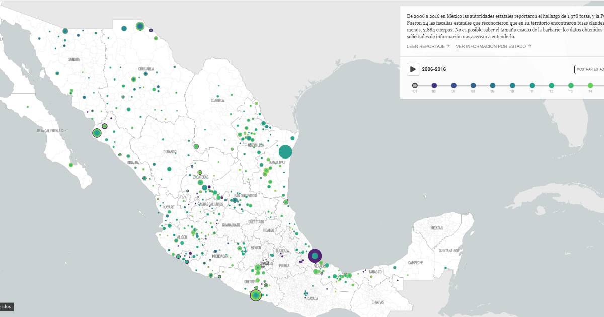 "El fenómeno creció a niveles de catástrofe si se toma en cuenta que en 2006 fueron descubiertas sólo 2 fosas y que en los años siguientes el número subió a cientos", anota la investigación que encabezaron las periodistas Marcela Turati, Alejandra Guillén y Mago Torres.