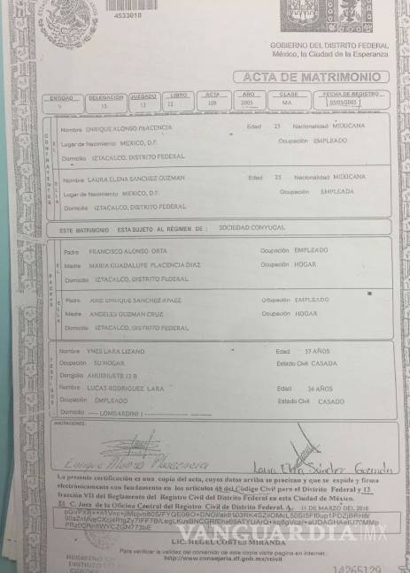 En el documento se puede leer que el alcalde es originario de la delegación Iztacalco, en la Ciudad de México, y es empleado. El matrimonio tuvo lugar el 5 de mayo de 2005 y está firmado por los cónyuges, que fue testificado por el licenciado Hegel Cortés Miranda.
