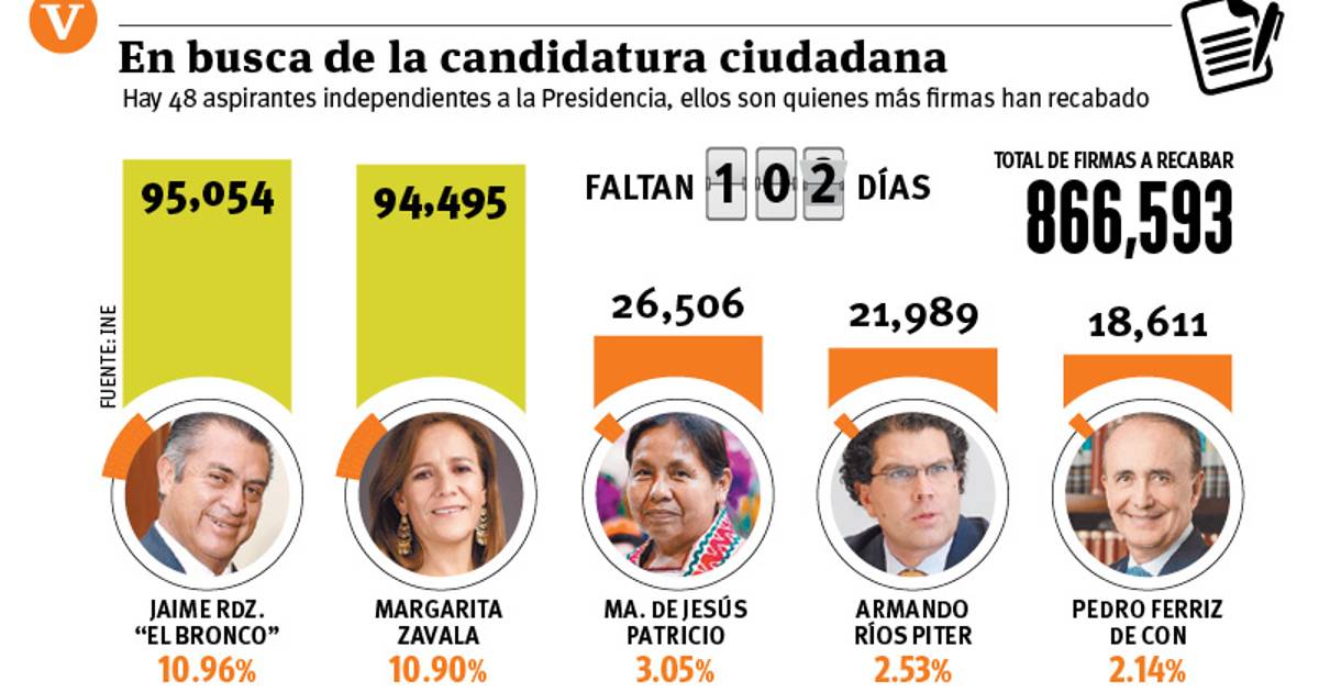 El gobernador de Nuevo León, Jaime Rodríguez Calderón, "El Bronco", rebasó a Margarita Zavala, quien desde el inicio del periodo para recolectar apoyos ciudadanos se había mantenido en primer lugar en el número de firmas.