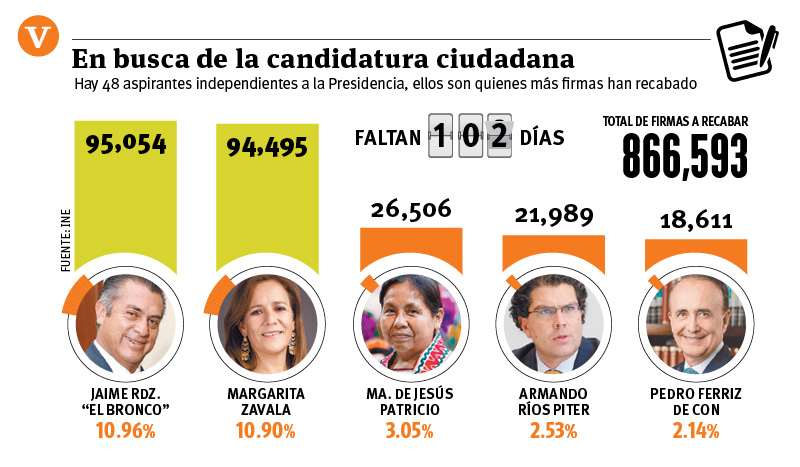 El gobernador de Nuevo León llegó a 95 mil 54 firmas, mientras Margarita se encuentra en 94 mil 495 apoyos; Morena acusa a Jaime Rodríguez de utilizar la estructura del gobierno para alcanzar su objetivo