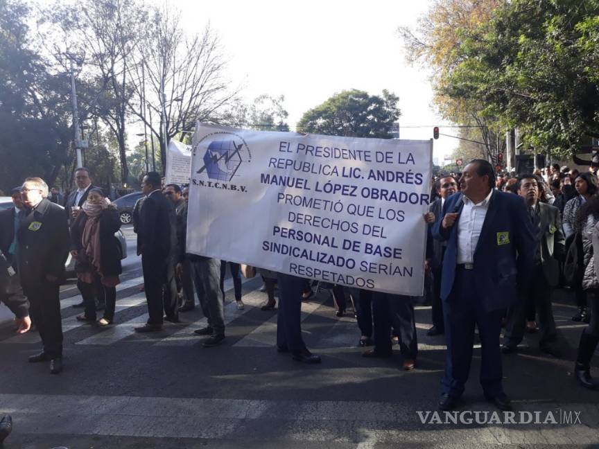 Ciudad de México. Empleados sindicalizados de la Comisión Nacional Bancaria y de Valores (CNBV), órgano regulador del sistema financiero mexicano, realizan una protesta por la sustitución del servicio médico privado al servicio que otorga el ISSSTE, como resultado de las medidas de austeridad implementadas por el gobierno a partir del 1 de enero de 2019.