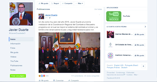 CDMX.- La página de Facebook de Javier Duarte recobró actividad este martes al publicarse contenidos del sitio javierduarte.org, una página de promoción del exgobernador prófugo de Veracruz que es administrada por una agencia de marketing digital con sede en Hermosillo, Sonora.