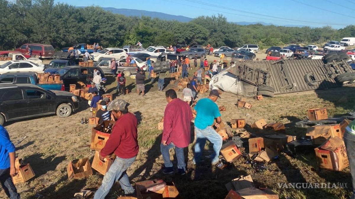 Elementos de la Guardia Nacional, asignados a carreteras, acudieron al lugar para resguardar la unidad y la mercancía, pero nada pudieron hacer para contener a una multitud que en cuestión de minutos arribó y cargó con los cartones de cerveza y las botellas sueltas.