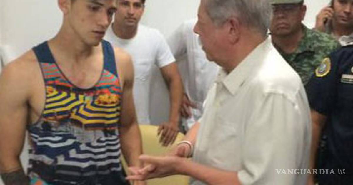 Alan Pulido reapareció con un brazo vendado y afirmó que se encontraba en buen estado de salud. A su lado estaba el gobernador de Tamaulipas, el priísta Egidio Torre.