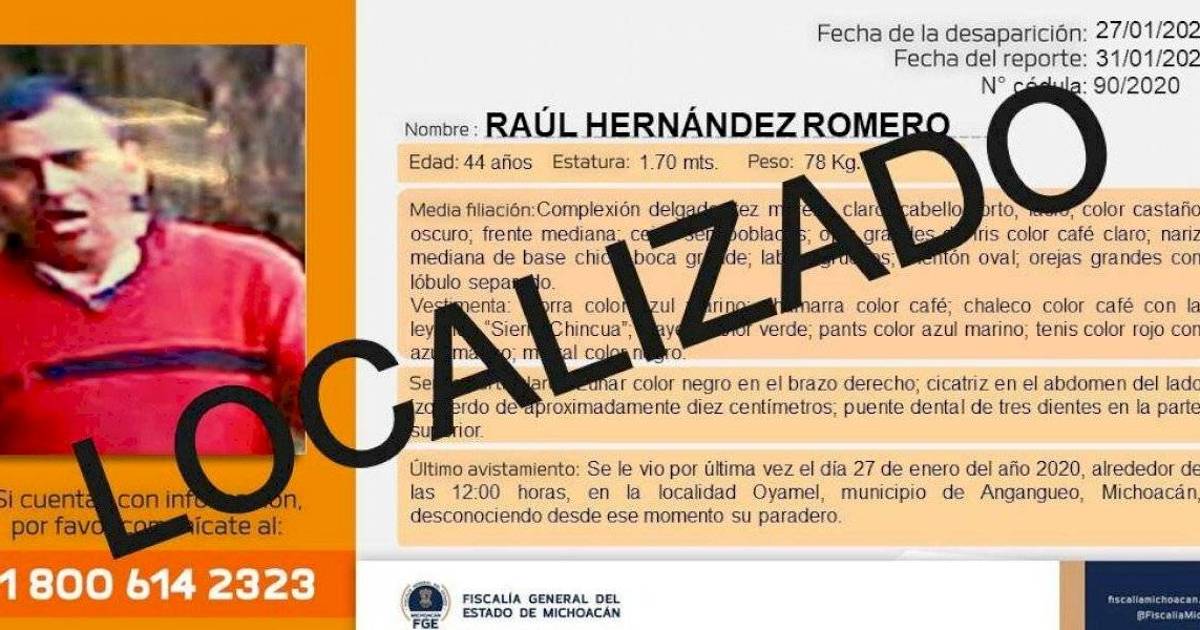 Informamos que RAÚL HERNÁNDEZ ROMERO ha sido localizado. Gracias por tu apoyo.#FGEMich pic.twitter.com/zsoRFeo4Y6