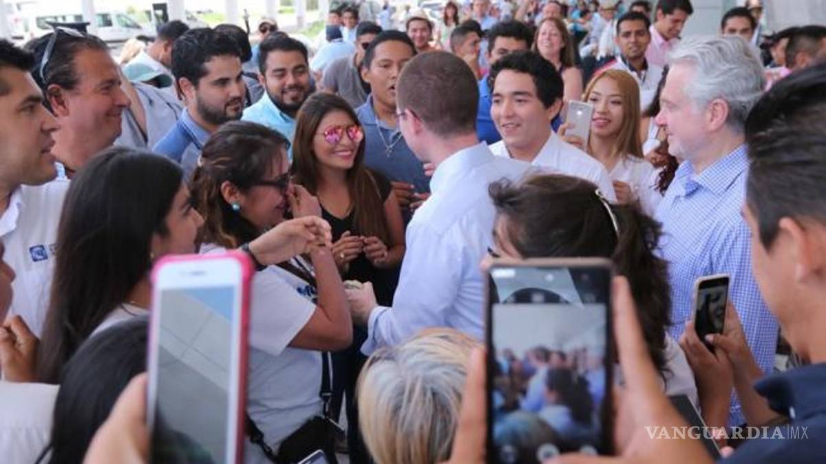 Al llegar al Aeropuerto Internacional de Cancún, Ricardo Anaya, candidato de la coalición Por México al Frente, fue recibido con porras a favor y consignas en contra por simpatizantes del PAN y de Morena.