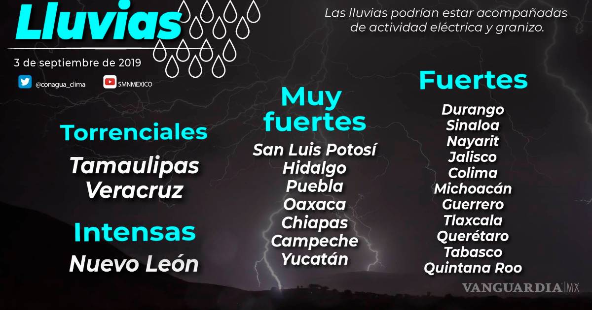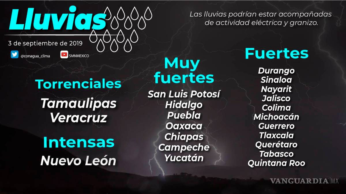 El Servicio Meteorológico Nacional informó que se prevé lluvia de fuerte a intensa principalmente en estos tres estados de la república