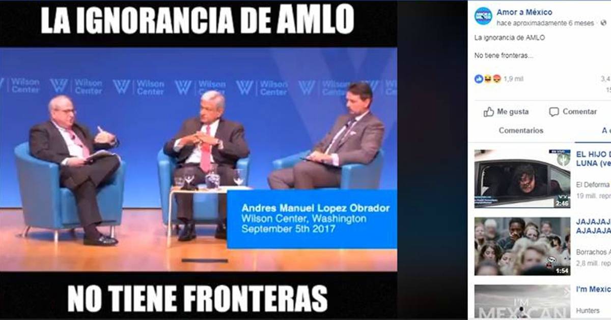 La publicación, acompañada de la leyenda “La ignorancia de AMLO no tiene fronteras”, se realizó el 11 de septiembre y, al cierre de esta edición, cuenta con mil 900 reacciones y 151 mil reproducciones. El video original es del 5 de septiembre de 2017, cuando López Obrador viajó a Washington, Estados Unidos, y participó en una mesa de diálogo con Duncan Wood, director del Centro Wilson y Michael Shifter, presidente del Diálogo Interamericano.