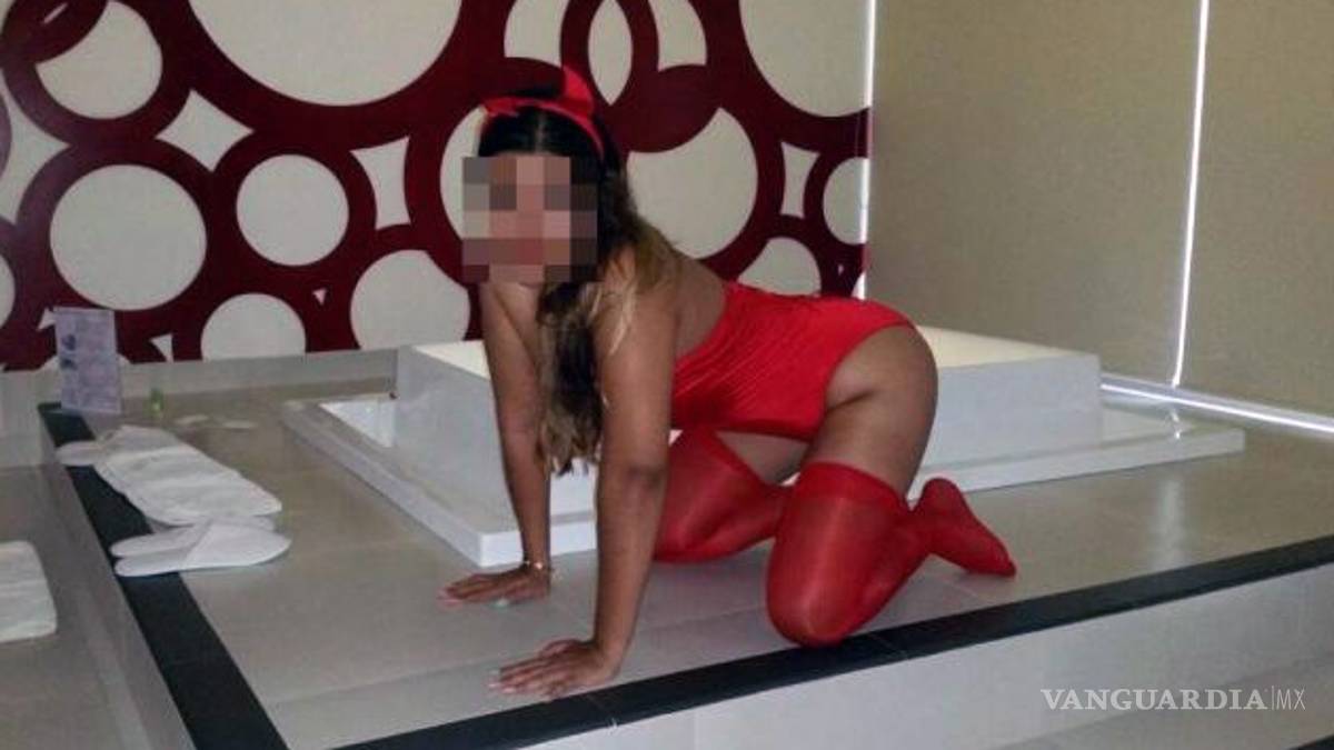 Ana Karen Morales Molina aparece con un disfraz de diablo color rojo y posando de rodillas cerca del jacuzzi en un hotel de paso.