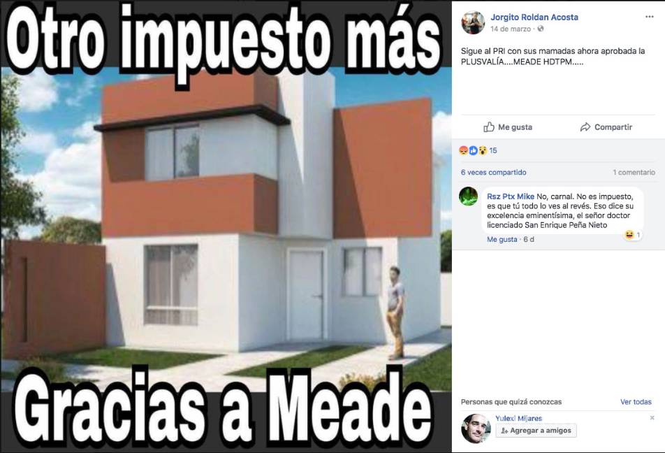 Una “cadena” compartida a través de las redes sociales asegura que, como titular de la Secretaría de Hacienda y Crédito Público (SHCP), el ahora precandidato del Partido Revolucionario Institucional, José Antonio Meade, impulsó una ley para cobrar un impuesto a la plusvalía de la vivienda. La información es falsa.