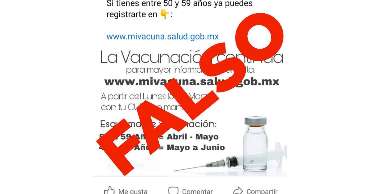 Circula en redes sociales un mensaje FALSO convocando a personas de 50 a 59 años para registrarse en la plataforma de vacunación contra #COVID19. En este momento no está abierto el registro a ese grupo; debemos terminar la aplicación a personas adultas mayores. pic.twitter.com/aCjRxkpCjn