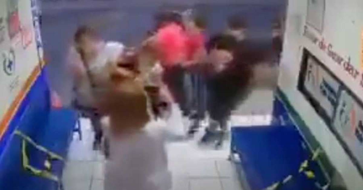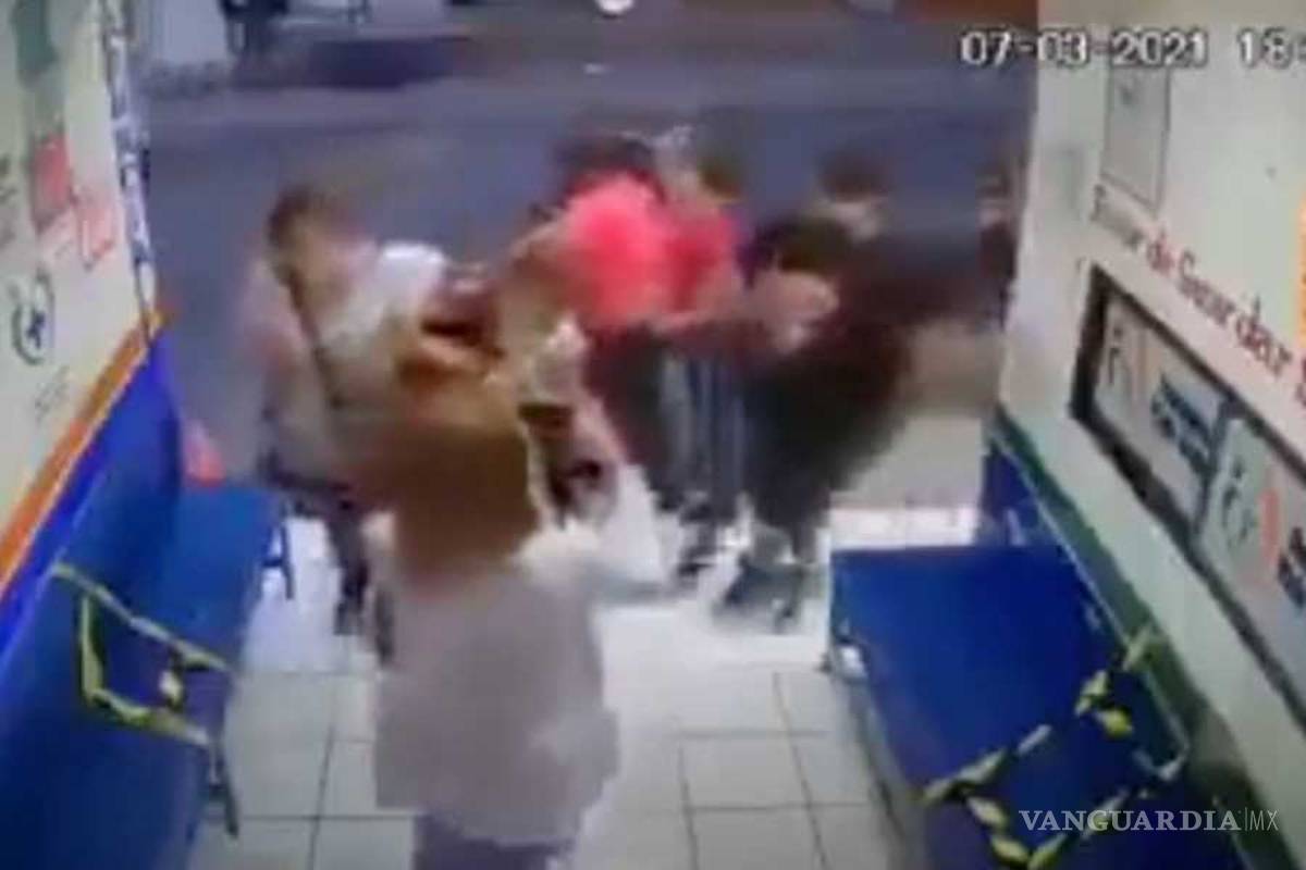 Una segunda mujer con blusa amarilla, quien también laboraría en la farmacia, intenta detener a una de las integrantes de la familia, quien la empuja e intenta golpearla en el rostro, mientras la doctora continúa grabando.