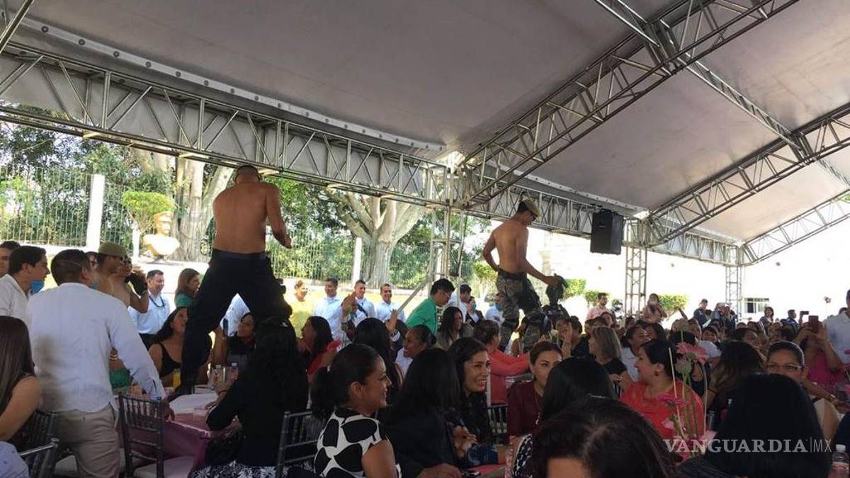 Fue entonces cuando efectivos de la corporación, algunos vestidos de civil y otros con el uniforme de la Fuerza Civil, comenzaron a realizar un streptease, se despojaron de sus playeras e incluso bailaron trepados en las mesas donde previamente habían comido las mujeres.