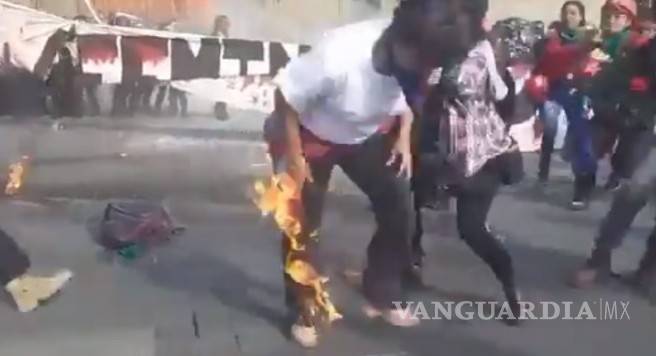 En el video de El Universal puede verse cómo una mujer lanza una bomba molotov contra los policías que resguardaban la puerta mariana de Palacio Nacional, pero el explosivo termina estallando frente a los fotógrafos.