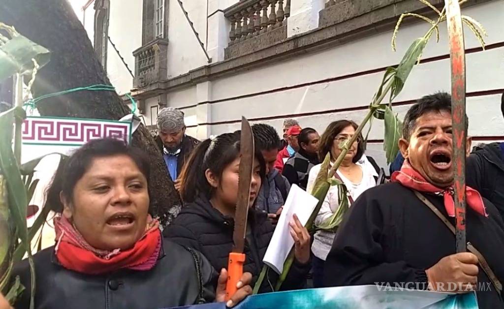 Integrantes de los pueblos afectados portan machetes, milpas, y pancartas como “Peña Nieto sembró despojo, terror y muerte en Atenco. Cancelación inmediata al aeropuerto”.