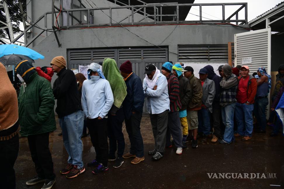 El mismo espacio que hace apenas una semana acogía a la primera caravana centroamericana bajo un sol abrasador, es ahora escenario de gente que se cubre con lo que puede, bolsas de basura incluidas, y de muchas mascarillas para no contagiar los resfriados.